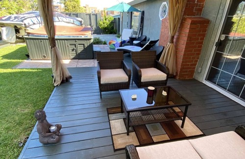 Modern 1 story bungalow in Huntington Beach. Mahogany wood floors,marble and granite throughout.Recessed lighting and rich decor. Fantastic location with private corner lot and large jacuzzi and BBQ.Large backyard,easy parking drive way 4 cars,AC(entire bungalow)great for summer,freebies,alarm,security cameras system.Boats and jetskis available for additional cost.new appliances,smart tvs ,wifi,custom bathrooms.Enjoy the famous Huntington beach ,take a trip to newport beach and laguna beach close by