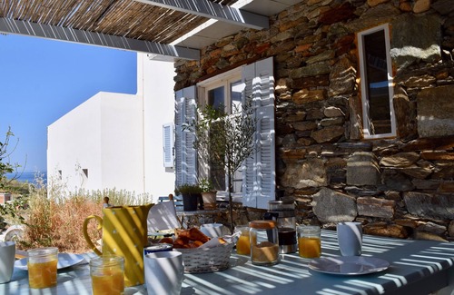 Our villas are set in more than an acre of organic gardens with their own olive grove, ecological vegetable gardens with figs, oranges and lemon trees (our Greek gardener will ensure you are provided with healthy produce each week), blazes of bougainvillea and passionflower tumbling down the house exteriors. You can walk in one direction into the hills and nature reserve areas of Northern Syros with more spectacular and semi-isolated beaches, and in the other direction through the valley (or along the cliffs) to the buzzing village of Kini around 1km away with its rich choice of restaurants along the sea front and its charming side streets with a mini-market and bakery.