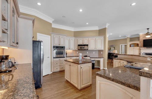 This stunning two-story home boasts a total of 5 bedrooms and 3.5 baths, offering plenty of space for your family and friends. The spacious kitchen is a chef's dream, complete with granite countertops, stainless steel appliances, and an eat-at bar. The large windows throughout the home provide fantastic views of the lake, and the separate dining room with a table that seats 8 is perfect for intimate meals.