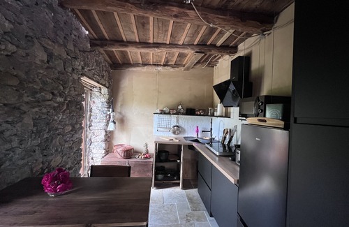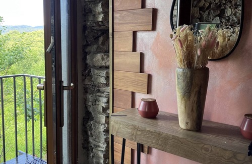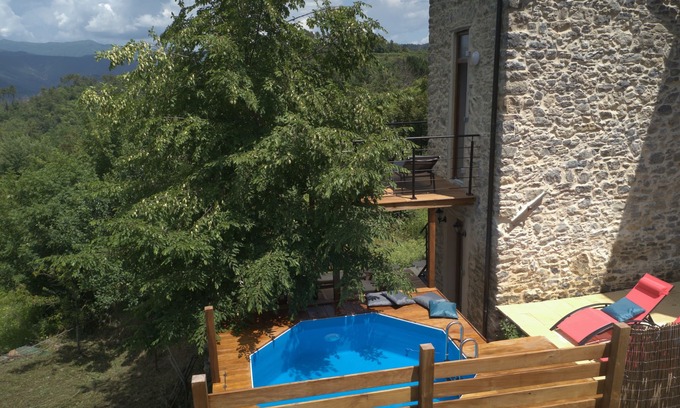 This small 30 m2 house on three levels, made of stone and chestnut wood, has 70 m2 of terraces and exotic wood decking around a charming small pool. It offers a breathtaking view of the Ligurian Apennines. Renovated with passion, fully equipped for a potentially long stay, it has been designed for romantic getaways and yours will be unforgettable. Located on the outskirts of a picturesque village nestled in the hills overlooking the Cinque Terre, bathed in sunlight, this small house for two is an island surrounded by greenery, ideally located to explore the region, which is full of treasures. It combines the charm of chestnut wood and the coolness of stone with modern and design equipment. The space has been optimized. On the ground floor, the fully equipped kitchen opens onto a spectacular terrace where you will have your meals facing the Ligurian Apennines, between nature and the pool, which can be heated in spring or autumn. In the evening, you will be intoxicated by the scents of the forest that it overlooks, comfortably seated in the small outdoor lounge. On the first floor, which you reach via an external staircase, the bedroom with a queen-size bed opens onto a small terrace dedicated to contemplating this sublime landscape. A spiral staircase leads to the second floor, occupied by a beautiful bathroom equipped with a large walk-in shower and a small dressing room.
