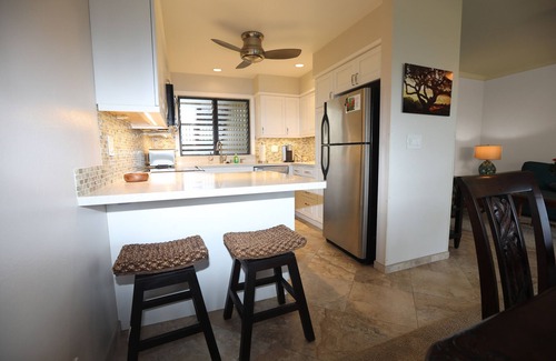 The furnishings are a relaxed, tropical Hawaiian style. The second floor location offers you an expansive view of pool, ocean and grounds. Also, the two bedroom/two bath layout works perfectly for either one or two couples. The master bedroom has a lanai (balcony) and faces the ocean, so you can't get any closer to the sound or view of the ocean. There is also a large lanai off the living room with chaise lounge, chairs and table. You can enjoy the relaxed atmosphere by breakfasting on either of the two private lanais and watching the ocean, exotic birds, beautifully landscaped grounds or relaxing with a glass of wine at sunset.