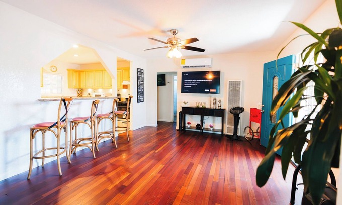 Cozy Home with High Chairs/Bar. Night Time Lighting Provides a great atmosphere. Secured and Gated Home with 4 Car Parking Lot. Newly Remodeled home with 3 Bedrooms. Now Available 55” 4K Smart TV with Youtube/Netflix Apps!