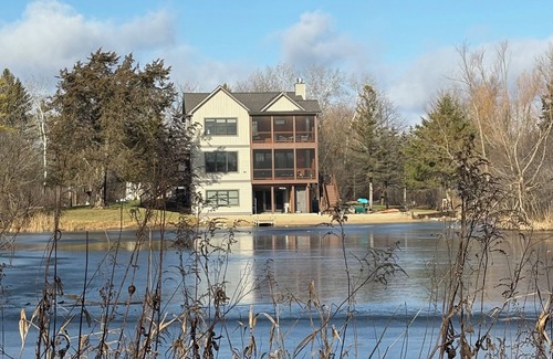 45 minutes from Milwaukee or Madison, and just over an hour from Chicago, our beautiful, recently rebuilt 3-story lakefront home sits on a secluded 50 acres, enjoyed by walking the trails in the summer and snowshoeing in winter. The 8-acre lake is completely private and is fantastic for swimming, canoeing, kayaking, and fishing! Two screened decks offer a perfect place to read the morning paper and drink coffee, play games, and watch Wisconsin's incredible bird life or summer storms.