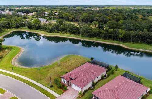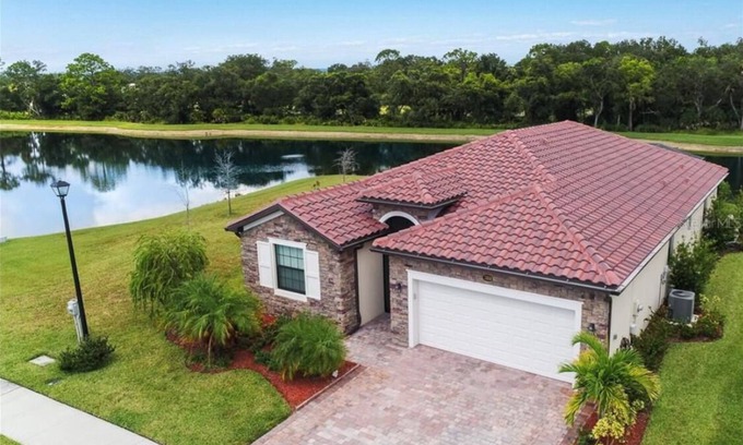 Situated in the West Villages, one of the best master-planned communities in the country, this nearly new build in Gran Paradiso blends tranquil lakefront living with an inspiring coastal-infused interior design. One of the best homesites available WITH 270-degrees of water views and natural splendor just beyond. Step inside through the screened front porch to the open-concept layout, adorned with ample upgrades including upgraded light fixtures and fans, crown molding, and tile on the diagonal. The host in you will love entertaining in the great room, including dining, living room, and open kitchen. Explore your culinary creativity in the gourmet kitchen, adorned with breakfast bar, crisp white cabinetry, granite surfaces, and stainless appliances. Winding down everyday becomes a cherished ritual in the master suite, offering lake views, walk-in closet, and spacious master bath. Three additional bedrooms provide comfort and privacy for loved ones. Perfect for sun-drenched afternoons, head out the shimmering heated salt water pool & jacuzzi. Your favorite tunes create a relaxing setting played from the sound system. Gran Paradiso is a resort-style community with pool, tennis courts, pickle ball, fitness trails, and state-of-the-art fitness center. Right across the street is the Atlanta Braves Spring Training facility at the CoolToday Stadium. Close to all shopping and only 10 miles to the beach.