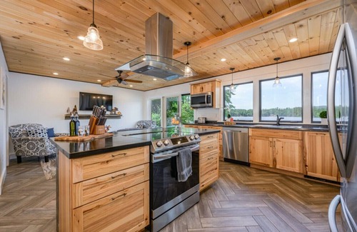 After a day of adventure, unwind in the hot tub under a canopy of stars or curl up by the beachside fire pit, surrounded by the frozen beauty of the lake. Indoors, natural light streams through expansive windows, illuminating cozy spaces perfect for sharing stories or enjoying a quiet moment.