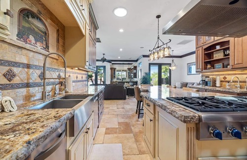 Stunning Outdoor Amenities: The property features a breathtaking pool, spa, and outdoor kitchen complete with a pizza oven, providing a perfect backdrop for pre-wedding gatherings or post-ceremony relaxation.