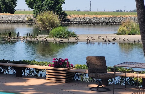 It's a perfect place to sit back and watch the water life. In the evening stroll down the beautiful floral walkway through pink oleanders. Relax on the dock with your glass of wine or umbrella drinks and enjoy the wonderful sunsets and wildlife. There’s white and blue heron, ducks, geese, otters, and even a white pelican or seal from time to time. Bring your camera and binoculars!