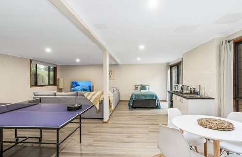 Downstairs, a spacious rumpus room with two king single beds, comfy couch, ping pong table and large TV is a kid-friendly haven for games (including a WiiU), movies, or quiet time after a day at the beach.