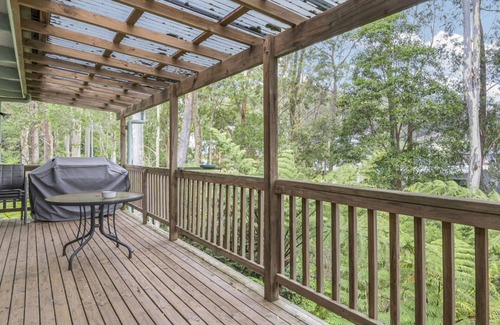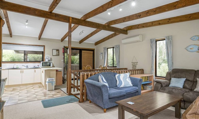The open-plan living area is warm and inviting, with comfortable seating, ocean views through the trees, and a fully equipped kitchen. Enjoy a family bbq on the deck while an array of parrots pay a visit and delight the kids with their antics.