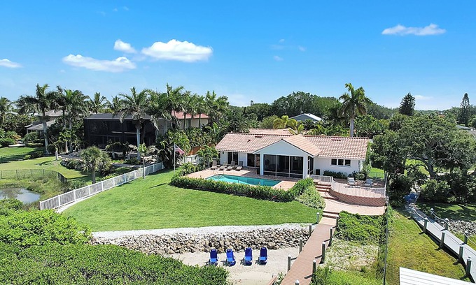 Intercoastal, Blackburn Bay waterfront home with boating facilities near Casey Key and Siesta Key. On a point facing the setting sun. This is simply paradise.