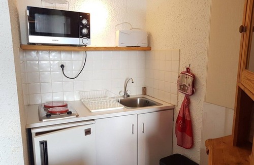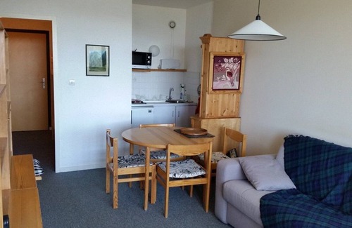 The apartment is composed of an entrance with two bunk beds, a shower room with toilet, a kitchenette open on living room with a sofa bed and a balcony West exposure which will offer you a beautifull view over the whole valley.