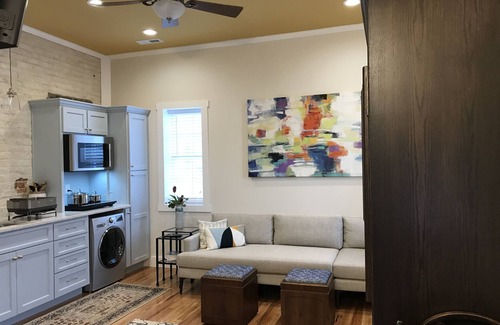 Inside, you'll find all the amenities you need in your ultimate home-away-from-home, including wireless internet access, in-unit laundry machines, and central air and heat for your comfort. After an eventful day exploring the area, come home to unwind in the cozy living room, where you can watch your favorite show on the 55 inch, 4k, smart TV, equipped with all your favorite cable channels. Later, refuel with a delicious home-cooked meal prepared in the fully stocked kitchen or grilled out on your private patio. Top off the night with relaxing conversation between friends and family on the patio or stroll back down main street to enjoy a cocktail at Old North State or your favorite beverage at one of our local breweries on Market Street.
