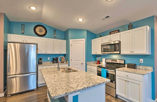 Providing a water view in a landlocked state, this patterned oasis has an open floor plan with step-free access to make any getaway a seamless experience. Boasting garage parking and Smart TVs, this 3-bedroom, 2-bath vacation rental is prepared for your needs. With an updated LifeSmart LS100 hot tub, a yard, and a private fenced patio, this outdoor space is thoughtfully designed for relaxation. Try Old Town Wichita nearby for dining and entertainment in repurposed 19th-century warehouses.