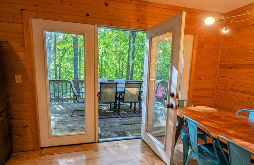 You will love our cabin! The setting is beautiful and peaceful with access to Raccoon Lake (kayaks available upon request), and you're close to all that Parke County has to offer: covered bridges, a delightful small downtown, and close proximity to Turkey Run & Shades State Parks. Enjoy the fireplace when it's colder, or the firepit for s'mores, as well as coffee on the back deck overlooking the woods. This is a great retreat for families, couples, or a few friends wanting a peaceful getaway.