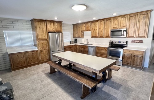The large kitchen has plenty of storage for all of your food and drinks. Comes fully stocked with coffee maker, cookware, BBQ tools, food storage containers, toaster, blender, dishes, cups, mugs and utensils.