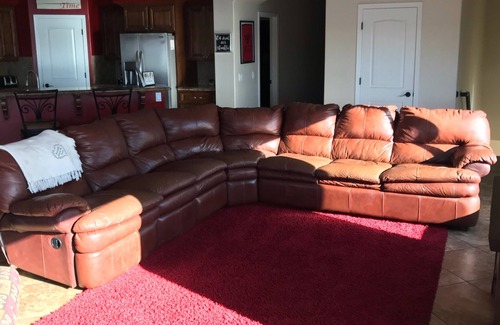 Great location right on the river with a dock for your boat. 4 bedroom and 4 bathroom 2 level house. Beautiful deck and waterfront patio. Upstairs has 3 bedrooms (1 with 2 Queens, and 2 with 1 King) and 3 bathrooms (2 in suite bathrooms), leather wrap around couch with sleeper sofa, full kitchen, living room, and deck. Downstairs has separate/private entrance with 1 Bedroom with 2 Queens, 1 bathroom, living area with sleeper sofa, and full kitchen as well. Perfect riverfront getaway. You won't be disappointed with this fantastic riverfront property with plenty of parking. Flat screen TVs in every room and living area. Free WIFI. Sorry, there is no Garage access and NO PETS ALLOWED.