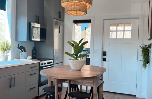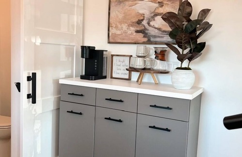Inside.. gas fireplace, with Smart TV in our cozy living area. 2 Queen bedroom’s with connecting bathrooms, small eat in kitchen with everything you need including a coffee bar. Half bath located right off the kitchen. The cabin sleeps 4 (not recommended for children under 5).