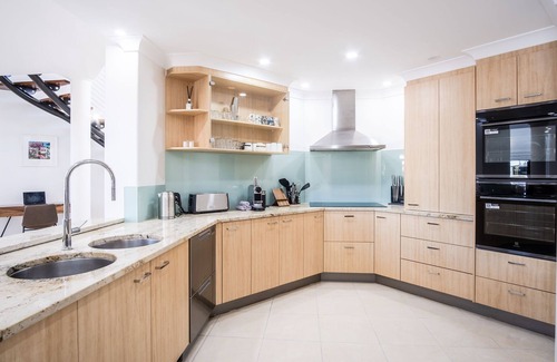 The large open plan entertainers kitchen & dining area is equipped with new modern appliances including two ovens, a 6 burner induction cooktop and walk in pantry and breakfast bar seating for 4. To the left is a small circular kitchen with seating for 4.