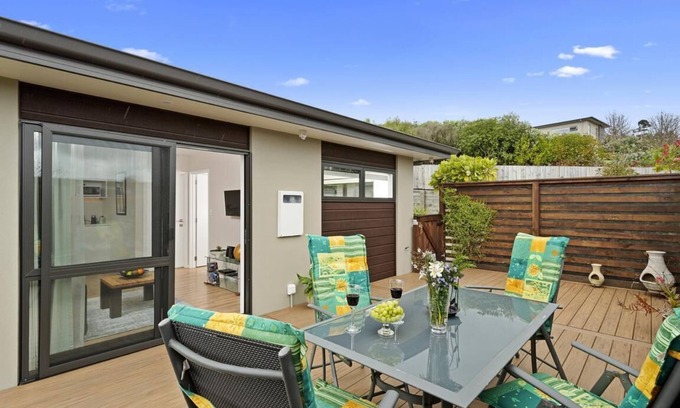 A gorgeous, private, modern guesthouse located in a quiet, semi-rural area of Welcome Bay, Tauranga. With separate bedroom, bathroom and lounge/dining area and kitchenette (please note there are NO cooking facilities). Features a large sunny patio with a garden outlook for relaxing with a book or enjoying a nice glass of wine outdoors.