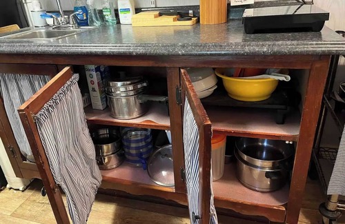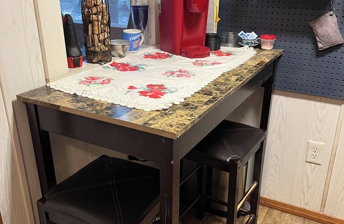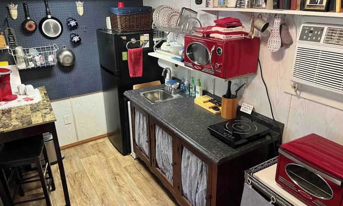 The cabin has through-the-wall AC and heat. Hot and cold running water is available at the kitchen sink. Dishes, cookware, and various appliances are provided. A TV with firestick provides plenty of indoor entertainment. There is also an attached covered deck and a large fire ring with chairs and loungers. A charcoal grill is available. Please note that the cabin utilizes an odorless and easy-to-use compost toilet, and we take care of disposal. The shower is also outdoors, so in cold weather we will help you make other accommodations. (This is part of the reason for the price drop over the winter.)