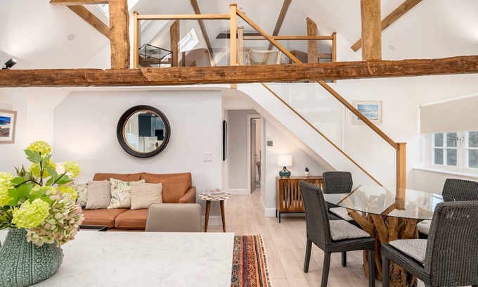 In the heart of the historic market town of Old Amersham, dating back to 1580 is the boutique, recently (2021) renovated and period Hops Cottage (given its name from the old hop house and brewery next door). The flat is on the first floor with a large vaulted living area with a mezzanine, full of light with windows on two sides and on the roof. The property still retains period features including original oak beams. Converted with luxury and comfort in mind, it makes for a memorable stay.
