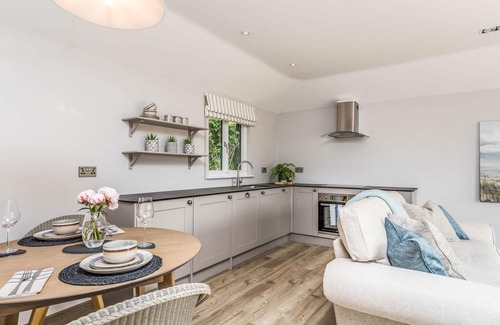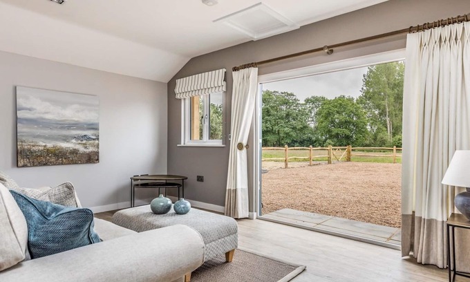 This charming stable conversion offers cosy accommodation with a king bedroom and en-suite shower room. The kitchen is well-equipped and spacious and is open plan with the sitting room and dining area. A large bi-fold door fully opens with views of the the meadow beyond! Retire to the comfortable sofa after dinner for a relaxing movie night in. Outside is a small patio area with table and chairs, perfect for enjoying a morning coffee or a sundowner.