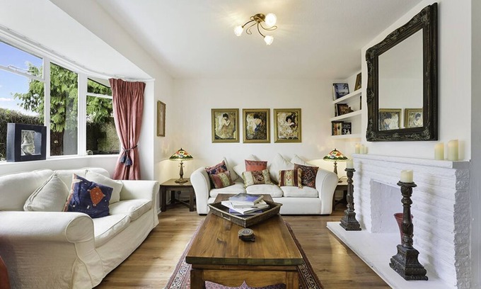 This Eclectic Hidden Cottage is warm and inviting with dark wood flooring, accented with light soft furnishings, original antique pieces, and various pieces of art work and antique mirrors which decorate the Snow White walls.