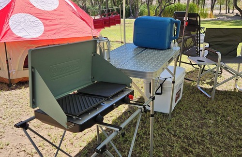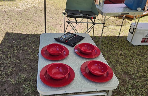 Our largest tent is set up for comfort and connection, featuring a queen cot with an air mattress, a queen-size sleeping bag, two pillows, and a lightweight comforter. Bringing the kids or a couple of extra adventurers? We can add two comfy floor mats, each with a big-and-tall sleeping bag, pillows, and their own cozy comforters. The tent can easily sleep six, and if you're up for some extra bonding, it can fit up to eight (just bring along extra bedding). This camp kitchen is ready for up to four guests. If you're bringing a few extra campers, no worries—we’ll include disposable dishes so everyone has what they need to dig in and enjoy. It’s the perfect setup for family camping fun! Each kitchen includes a shade tent, two-burner propane stove, plates, bowls, mugs, and utensils for four. A 9-cup percolator, coffee, and drinkable well water are provided. You'll also have all the essentials for camp cooking—pots, pans, mixing bowls, and utensils—ready to go. Guests have access to our full 120 acre ranch and surrounding BLM land to relax, hike, nature watch, and explore. Board games, lawn games, and a small library are provided for all guests free of charge. Each campsite has a portable toilet with privacy structure (they're not fancy, but it'll do!) and a solar heated shower. Because this is a working ranch with livestock and herding dogs, we do not allow any animals, other than trained service animals on the property. This is to protect both our animals and yours.