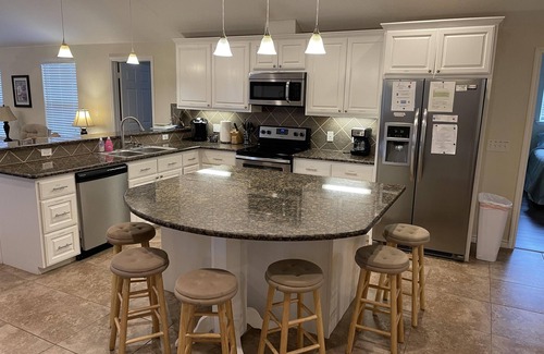 The home is very open and large in it's feel. The kitchen has granite counter tops with an island that is extended to add more dining or socializing room in addition to the bar top behind the sink peninsula. The built in refrigerator is complemented with a smaller island fridge for the kids drinks or adult beverages. Local catering is available upon request (advanced notice required) for those who want to take the night off from cooking.