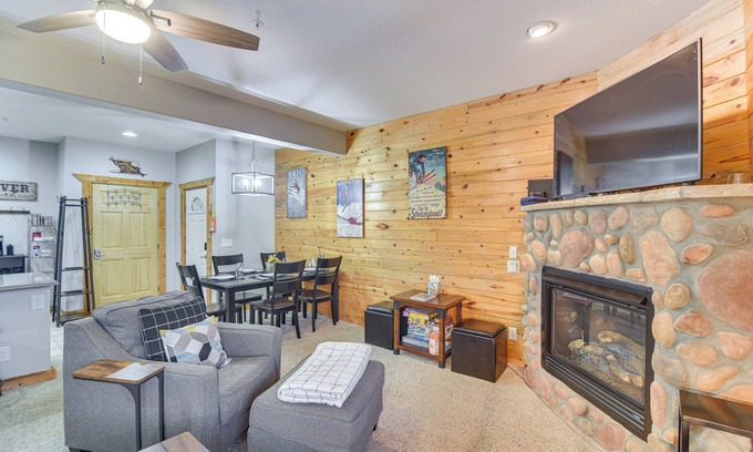 INDOOR LIVING: 2 Smart TVs, gas fireplace, ceiling fans, dining table, ski-themed decor, board games, books