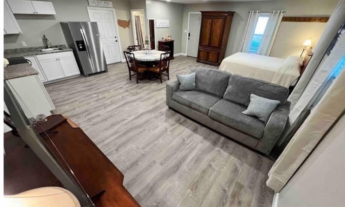 The studio apartment offers cozy historic decor with a living room and bedroom area and a fully stocked kitchen and bathroom. It's charming and includes a queen sized bed, optional queen sized sleeper mattress firm sofa, and an additional roll out bed. It has a private drive and is detached from any other living quarters.