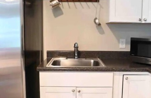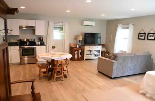 The studio apartment offers cozy patriotic decor with a living room and bedroom area and a fully stocked kitchen and bathroom. It's charming and includes a queen sized bed, optional queen sized sleeper mattress firm sofa, and an additional roll out bed. It has a private drive and is detached from any other living quarters.