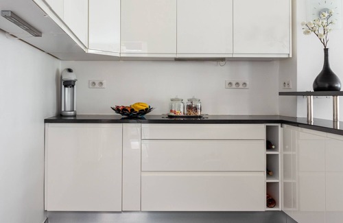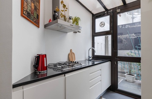 On the other side of the room is a sleek, generously-sized kitchen, complete with breakfast bar and stools. The kitchen continues through to the back of the house, keeping the cooking area helpfully separate and offering glass doors onto a little terrace. Why bother cooking if you can't sneak outside to sip a glass of wine every now and then?