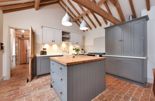 Overhead are beautiful honey-coloured beams, and underfoot is heated brick and oak flooring. The custom kitchen is very high end, and no matter what you're cooking, it always tastes nicer if it comes out of a posh Aga!
