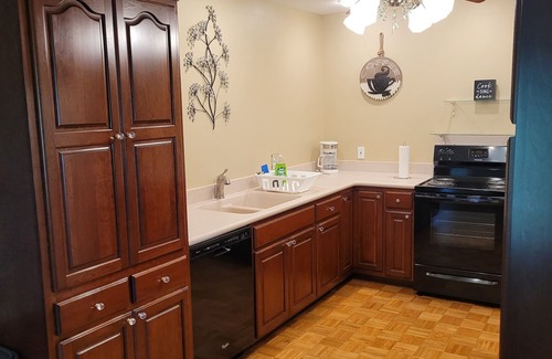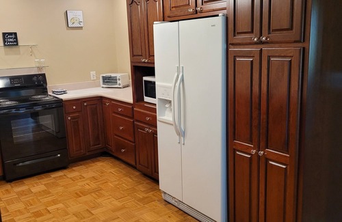 Appointed as well as a 5 star hotel. This home sits way off the road in the middle of mature hardwoods. Looks like a park! 2 car attached garage. Set up for short term executive stay, Honeymoons or Romantic Holidays. 2 Kings size beds if 2 couples would like to leave the kids at home and have an adult vacation or long weekend. You can't see another house from the screened in back porch from which you can hear a creek happily babbling by except for in extreme dry weather. Fully furnished Kitchen. Beds are down duvets and pillows. A sofa and two recliners in living room. Was set up with the need to sanitize everything between guests in mind. Smoking is not allowed inside but accommodations are made on the front and back porches. A desk and High speed WiFi connection are provided. This is next door to our home which has a pond with an island in the middle that has been the backdrop for many photo sessions that guests are welcome to visit.