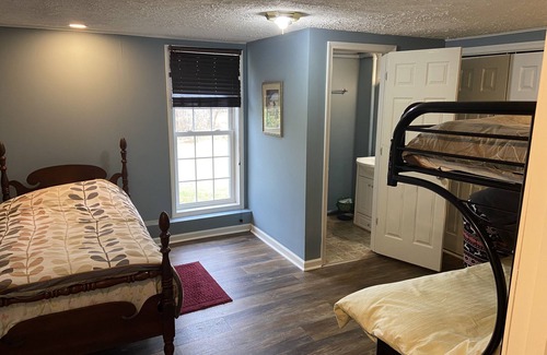 Newly renovated 100 year old farm house where you can enjoy Family activities like picnics, campfires, and more than 14 acres of woods for walks and hikes. Close to town for eating out or picking up comfort items. Sleeps 11 in 3 separate bedrooms with 2 baths, full kitchen, laundry room, and deck with breathtaking country view. Property sits adjacent to our other BnB with access to our animals (donkeys, cows, goats, chickens, our turkey and guineas and barn cats), our cave, the creek (which is excellent for swimming, fishing, kayaking or simply skipping rocks and watching nature drift by) and an additional 100 acres of woods for strolling or campfires. With Scottsville just a few minutes away you can conveniently jet into town to pick up grilling supplies complete with s'mores or eat our at one of our local vendors.