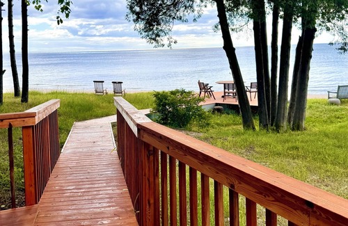 Welcome to a mid century home with soaring ceilings directly on the sands of Lake Michigan. Your private beach front getaway is easily accessible; 2 hours from Chicago, 45 minutes from Milwaukee. Listen to the pounding waves of Lake Michigan as you have coffee on the front deck. Walk the sandy beach, swim, then come back and enjoy a drink as you soak in the hot tub and watch bald eagles dive for their meals. Then dine in the enclosed glass room. Pets are welcome but extra. They must be outdoors toilet trained, non aggressive and under the owners control at all times, not left alone, and have all their vaccinations. Contactme with any Qs. This is a wooded area and with that, there are animals that live in the natural habitat.