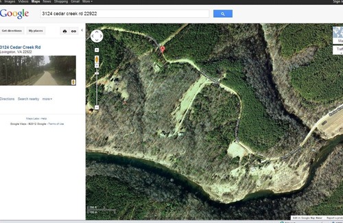 Rocky Run Landing sits back in a loblolly pine grove just under the crest of Hawk Ridge in the foothills of the Blue Ridge Mountains. The cabin is two miles up the Tye River from the village of Norwood and the James River in southern Nelson County, Virginia. The address is 3124 Cedar Creek Road, Arrington, VA 22922. The cabin has a telephone, but no long distance service. Your calling card will work with this phone. You’ll have to find just the right spot to use your cell phone. Wireless internet is available via satellite.