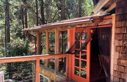 The Lilacs is a beautifully restored, cozy 1920's Redwood cabin on Palomar Mountain just 1:25 minutes from San Diego. The cabin has 1) Master bedroom, 2) a small room with desk/dresser & ladder to the LOFT for the adventurous sleepers, plus 3) a futon sofa-bed in main living room, where there is the original rock hearth. ALSO a large, full-glassed in, sun room, a complete kitchen (new stainless steel stove/oven, microwave, dishwasher, washer/drier, cookware and more).