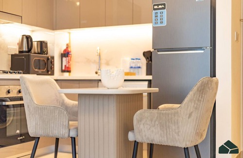 Escape to this peaceful 2BR apartment by Book My Stay in Azizi Gardens, Meydan. Located in a quiet residential area, this modern retreat features two spacious bedrooms, two sleek bathrooms, a cozy living room, a dining area, and a fully equipped kitchen. Enjoy high-speed Wi-Fi, air conditioning, and free parking. Just a short drive from Downtown Dubai, DXB Airport, and Old Dubai, it’s the perfect spot for families, couples, or friends seeking both comfort and convenience.