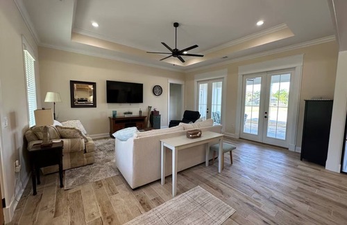The 3rd bedroom is handicapped accessible as well as bathroom. We provide you with a shower chair and rails for your convenience at request. You have a full backyard on a pond that is ideal for fishing. Hosts are located2 doors done from the home so if you ever need anything, we are here. Your home is set up with a starter pack of paper goods, spices and other essential items. Renter is responsible to purchase additional items for their stay. Dollar Tree and Publix are within a 2 mile radius and less than 5 miles to Walmart.