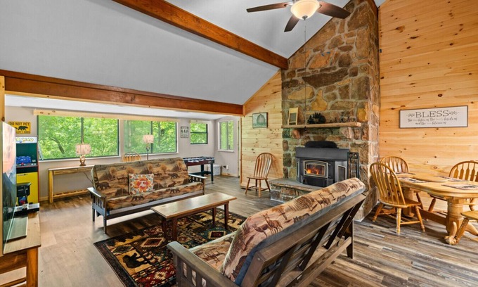 Cozy, fully furnished cabin in a fantastic location near the Great Smoky Mountains National Park! The main level features an open floor plan with a well-equipped kitchen, a dining table perfect for family meals, and a comfortable living area with plush seating, a Smart TV, a fireplace, and an arcade game for a bit of indoor fun. There are three bedrooms bedrooms -- King-sized bed, Queen-sized bed, and 2 Twin Bunkbeds. Step out onto the peaceful decks and breathe in the fresh mountain air—perfect for a quiet morning coffee or winding down after a day of exploring the park just minutes away.