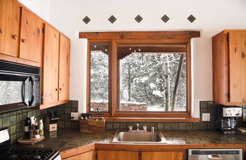 This home is unique in ways that only exist in Taos! The casita has high Vigas ceilings and radiant heat through the custom slate floor. Beneath a bank of windows with mountain views is a one of a kind sandbox- it can be used as a zen sand meditation garden, or hours of play for young and old alike!