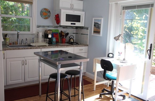 This marvelous studio cottage in Oakland is the perfect cozy retreat for guests. With a comfortable queen bed and a convenient sofa bed, this adorable space is ideal for a relaxing stay, for up to 3 people, although it works best with 2 adults and a child (or of course 1 person). Enjoy the wonderful amenities provided, including a hair dryer, iron, WiFi, and heating. The bathroom features a bathtub/shower. Writers, academics, grandparents, executives and vacationers have enjoyed staying here since 2014.