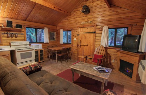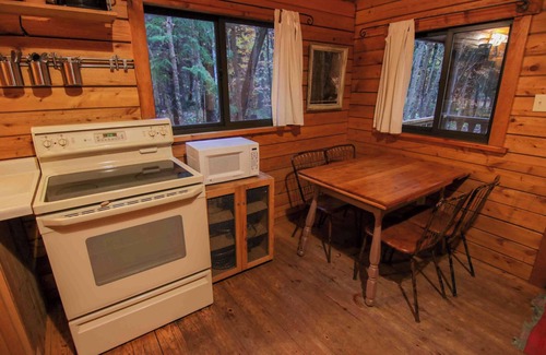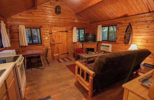 Inside, the cabin features 1 bedroom with 4 twin beds (2 bunk sets) and a queen futon in the living room. The fully equipped kitchen includes dishes, silverware, a coffee maker, and all the essentials for preparing meals. With air conditioning, heating, and a private bathroom with a shower and toilet, you'll enjoy all the comforts of home.