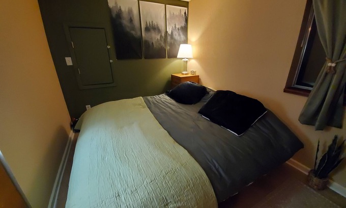 Stay cozy with a Cal King bed and your own wood burning stove! If you don't want to stoke the fire there's also ceramic heating available. Microwave, toaster, mini fridge, and coffee maker along with basic coffee supplies available in the room.