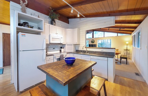 Our cozy 3 bedroom chalet has 2 queen beds and a bunk room with 2 twin bunk beds on the lower level. Upstairs is an open living room, kitchen and dining area where everyone can gather.