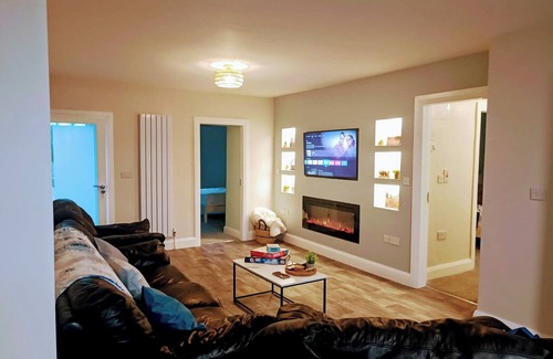 The open plan living space is equipped with 50" TV, Now TV entertainment package, WiFi, a washing machine, dryer, central heating, iron.