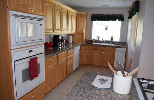 The kitchen has everything you need to make yourself feel at home, with pots, pans, and dining utensils for the whole family. Need to wash some clothes? A full-size washer and dryer are available as well.