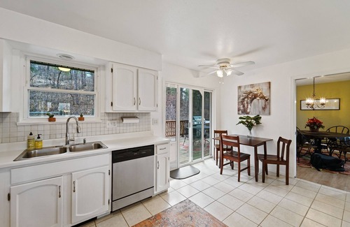 Spacious Dining and Living areas boast plenty of seating with a lovely leather reclining couch. Get cozy by the fireplace and snuggle up with blankets while you enjoy a movie or play board games. Tvs have smart and/or Roku to access your TV accounts, Netflix, Amazon, Hulu etc.
